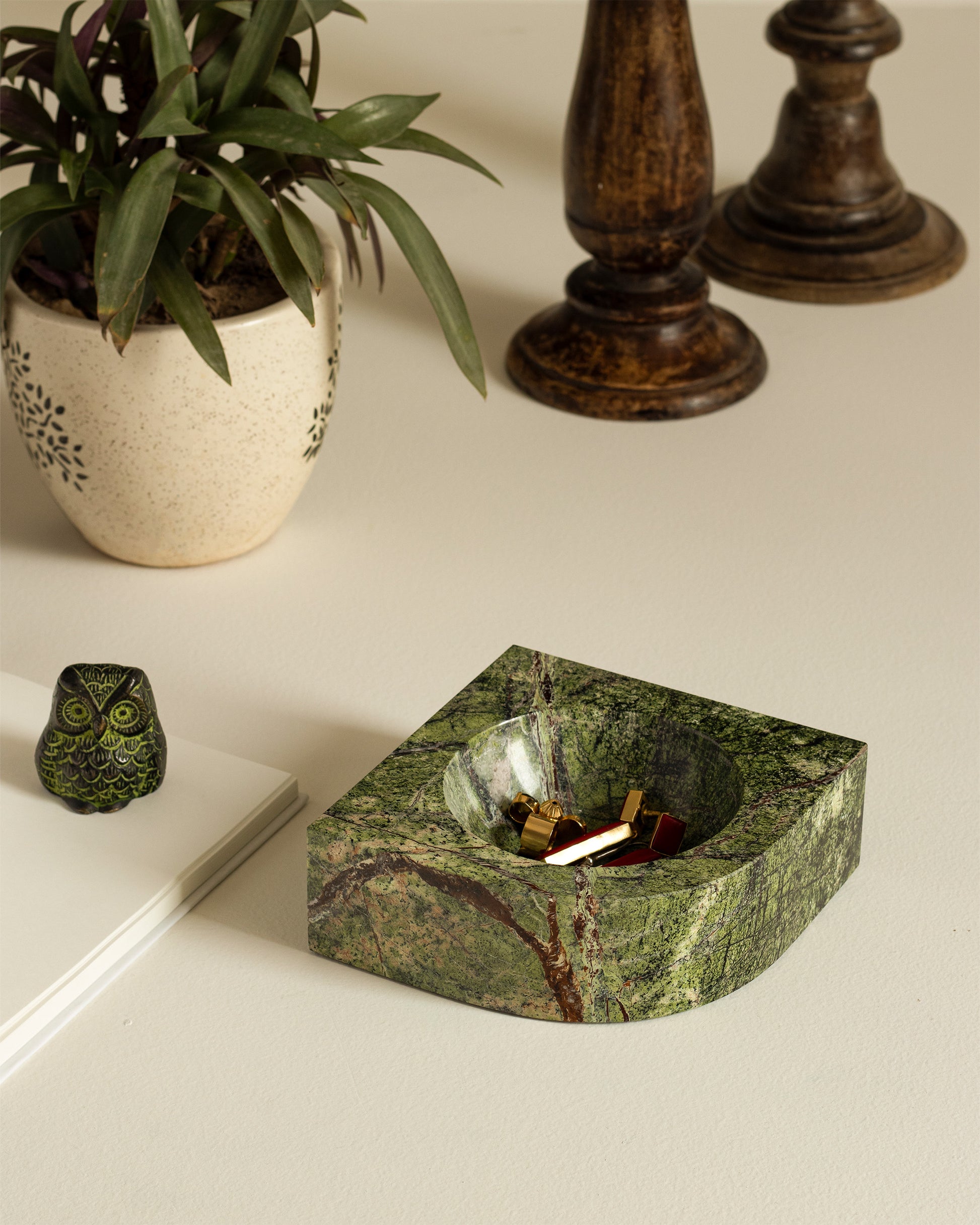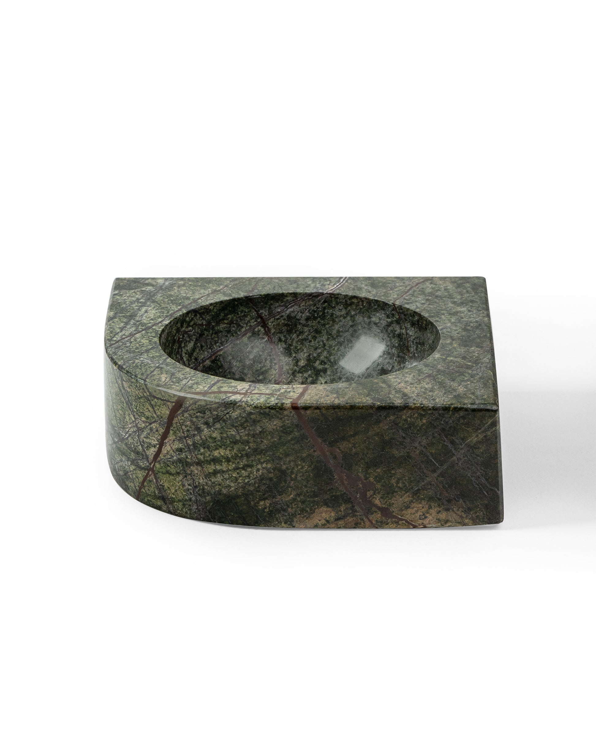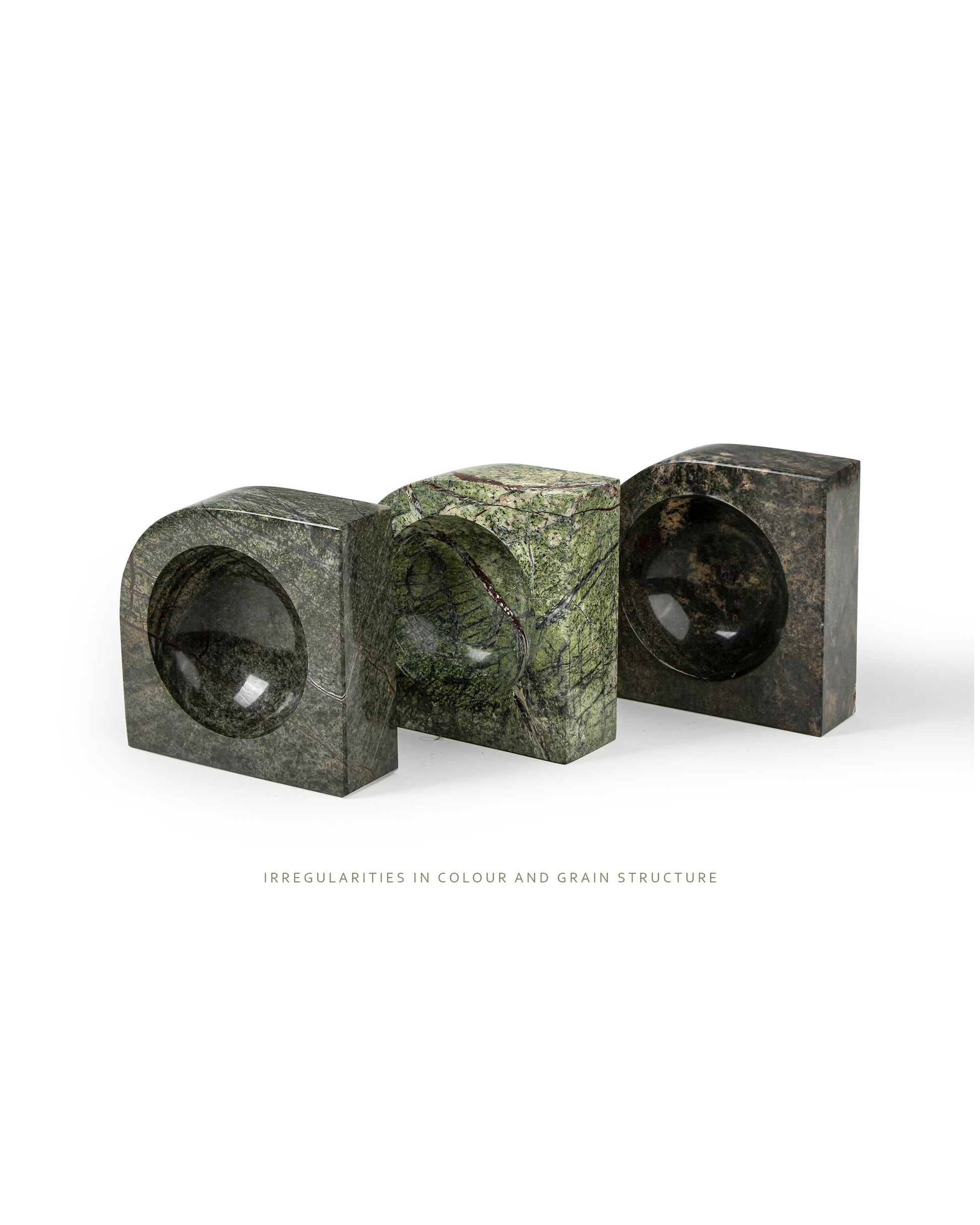 A stationary bowl made in the extraordinary green marble known as Bidasar. The timeless and ever-changing texture of the stone holds nature's secrets while the minimal curves keep it contemporary. It can be used as a keepsake bowl for your valuables. Every piece of Bidasar Bowl is unique.