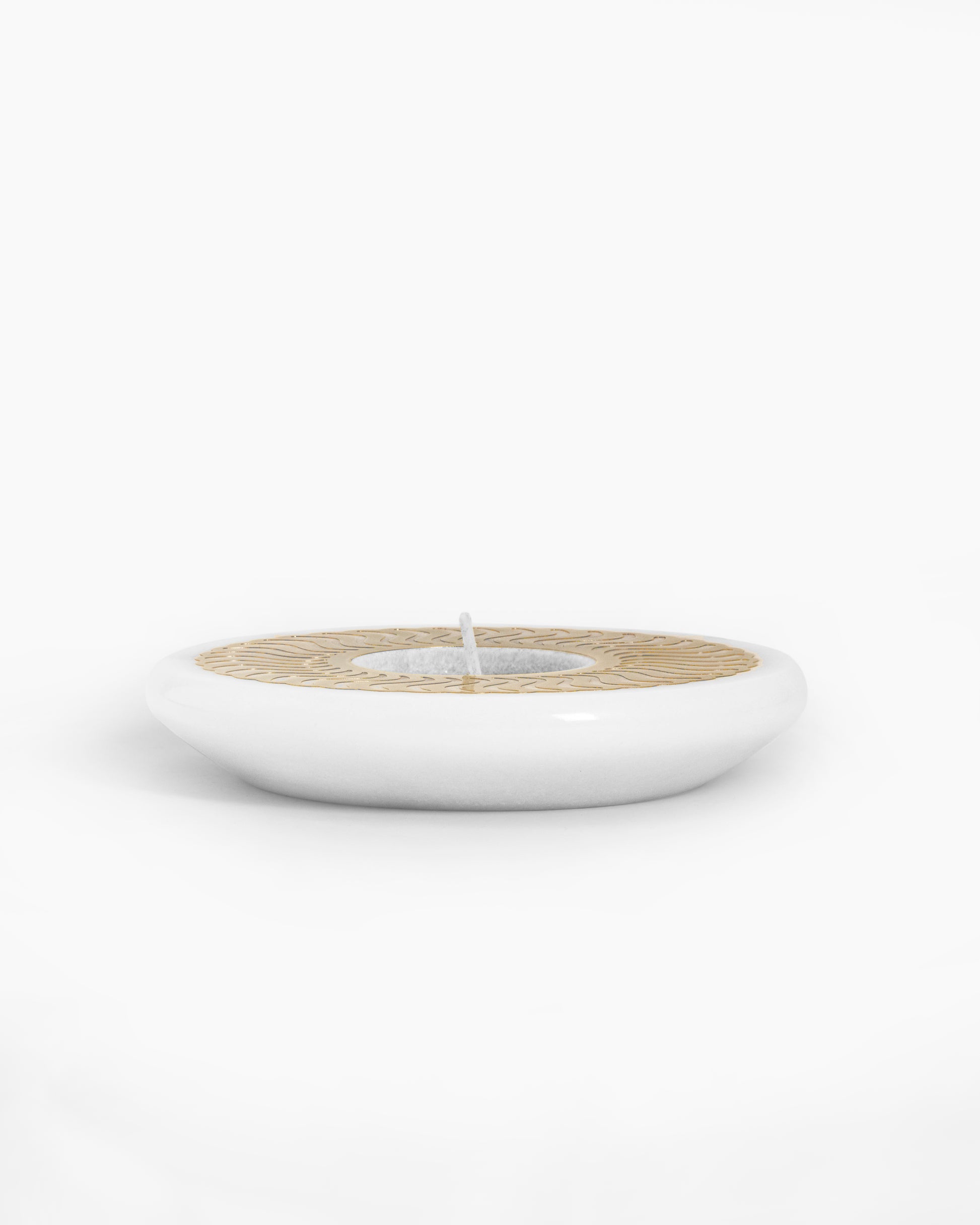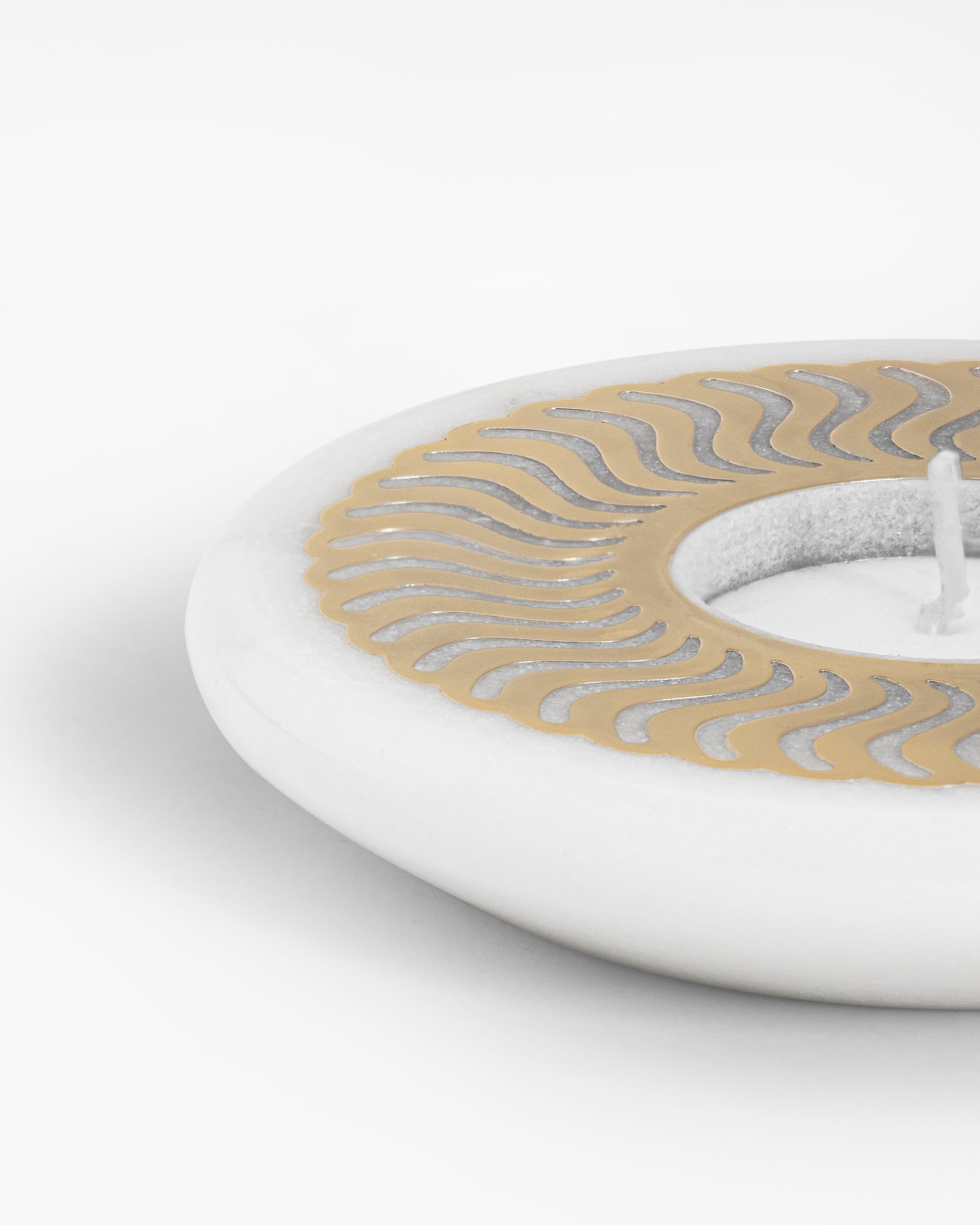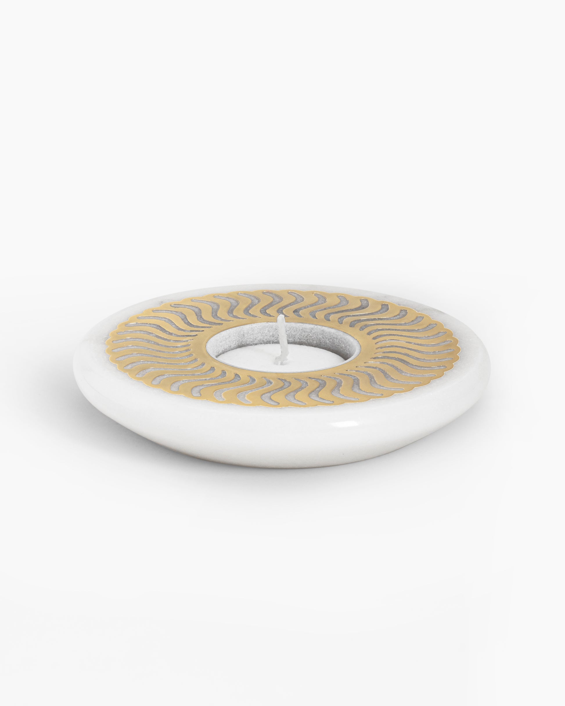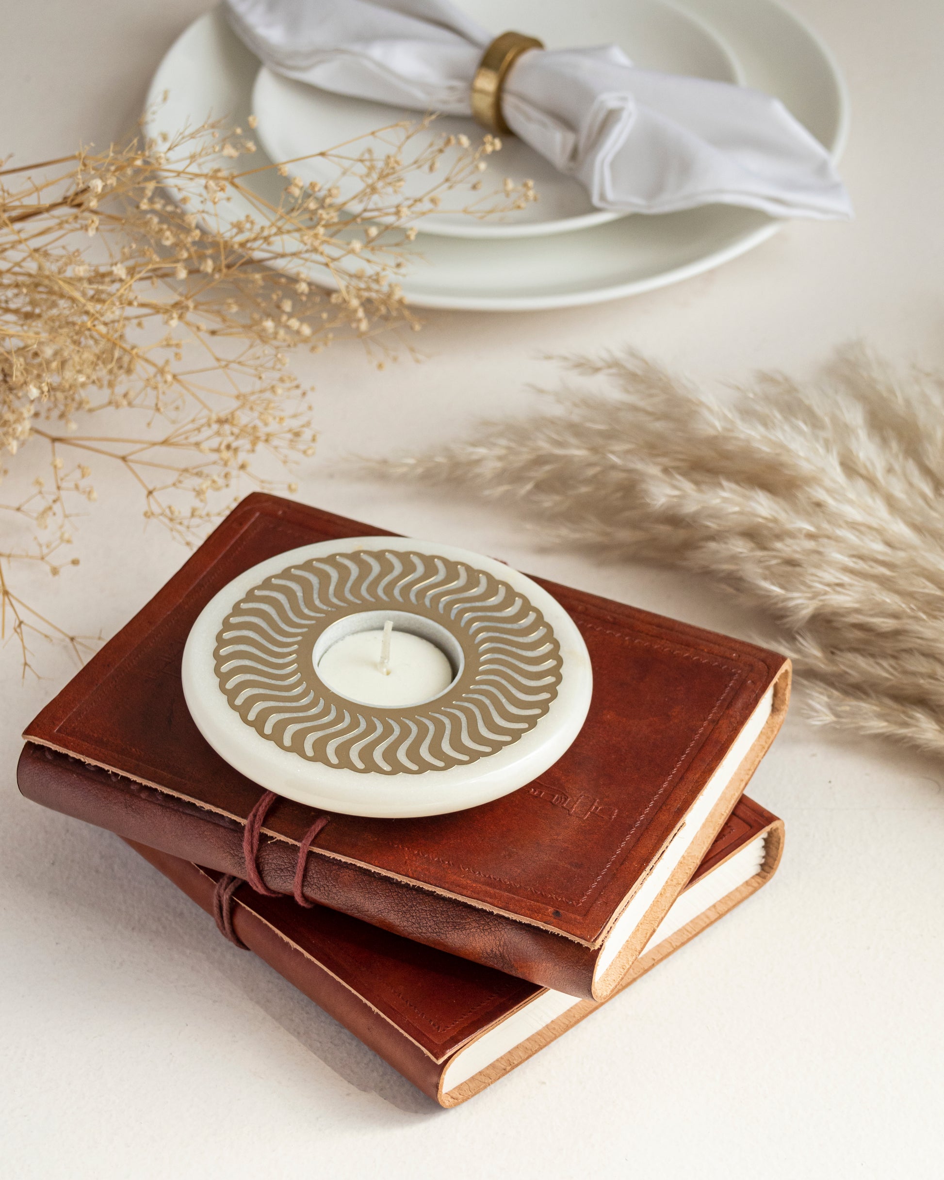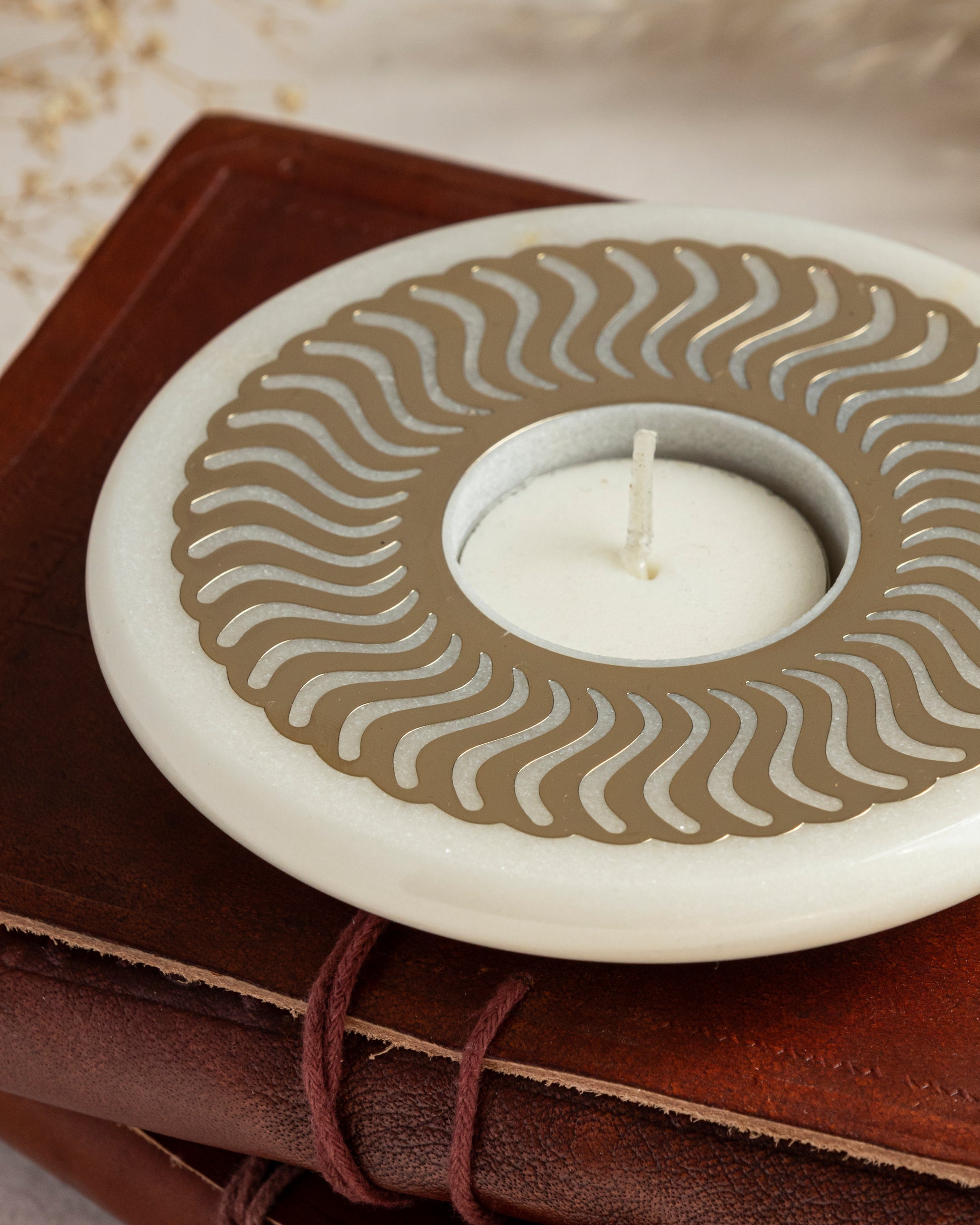 This glossy marble plate topped with a fine-cut brass sheet gives a perfect ambiance for any occasion. Light them up in your dining hall for an enigmatic setting for your senses. We suggest buying these in a set of two to create more impact in your setting. Available in two color variants.