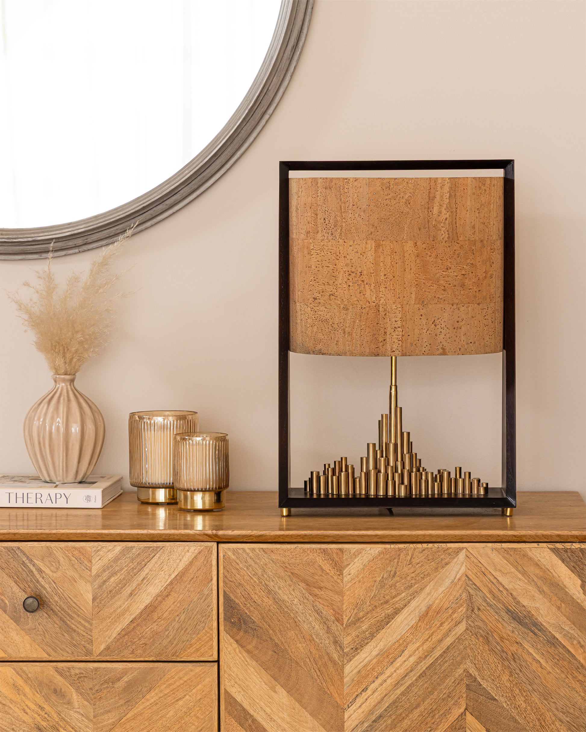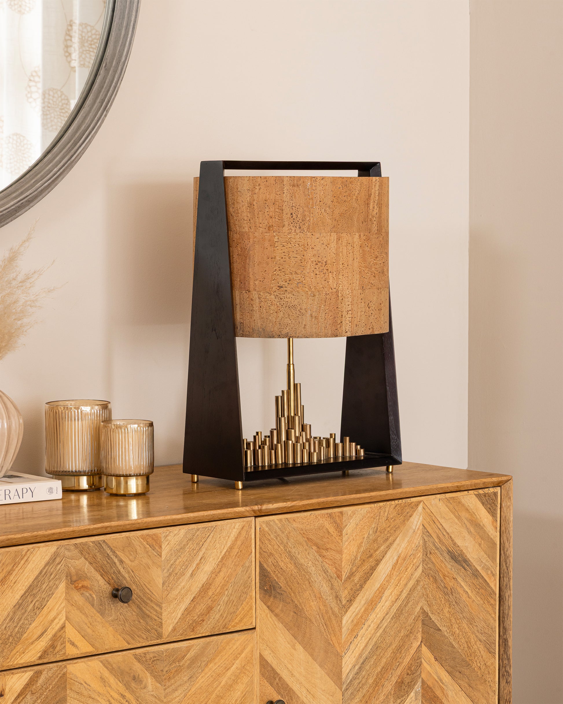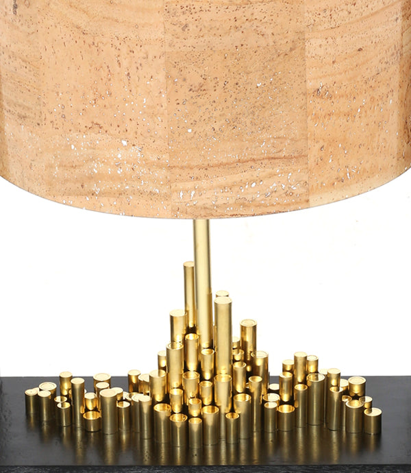 Delicately built inside a wooden frame, the city(pipes )is made of brass and the shielding shade above is made out of cork sheet.