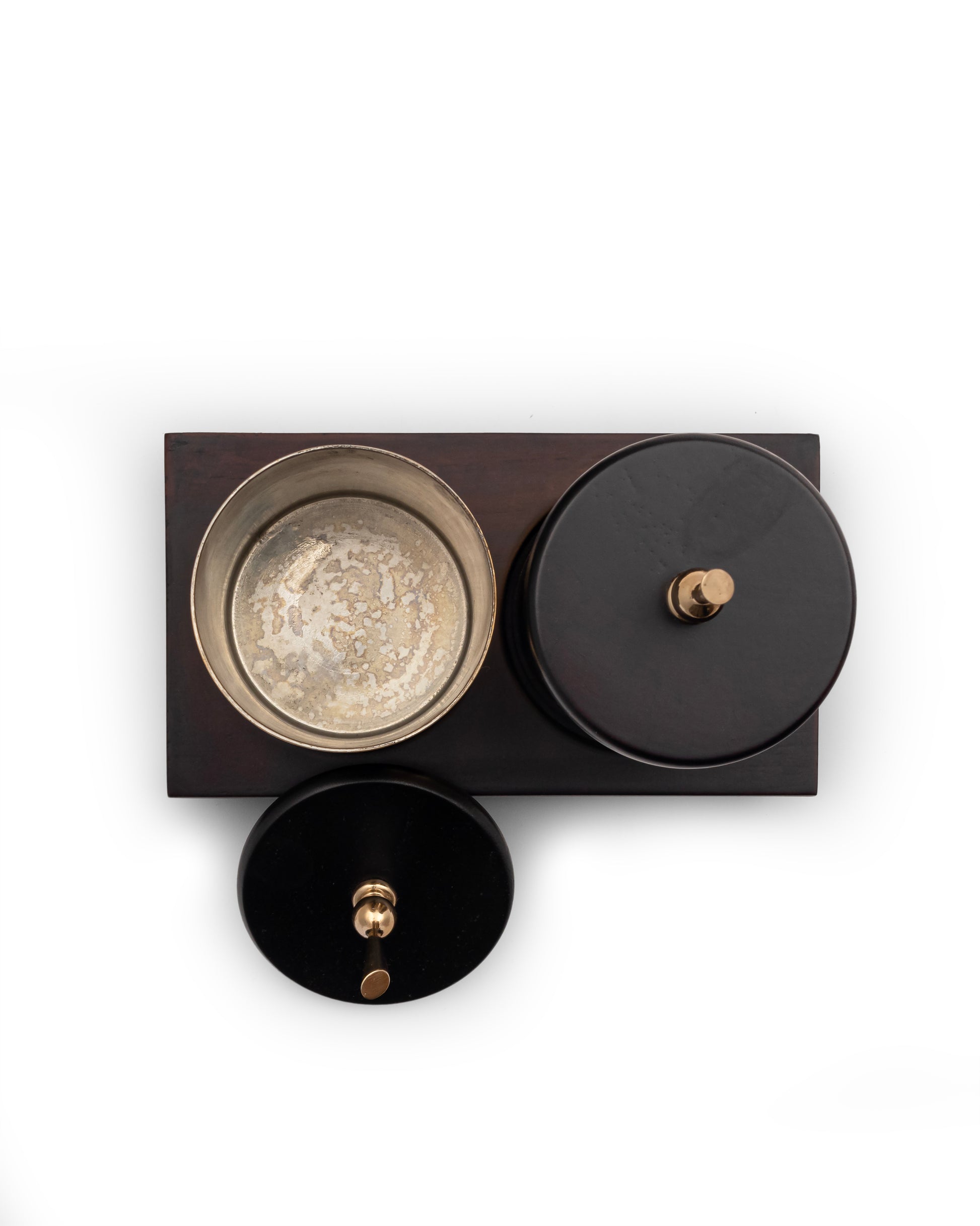 Elevate your dining and serving experience with our Condiment Server Small (Set of 2). Made with brass, wood, and casted brass knobs, this handcrafted blend of traditional and modern forms exudes elegance. The inside is coated with tin (kalai) for food safety, making it the perfect addition to any dining table.