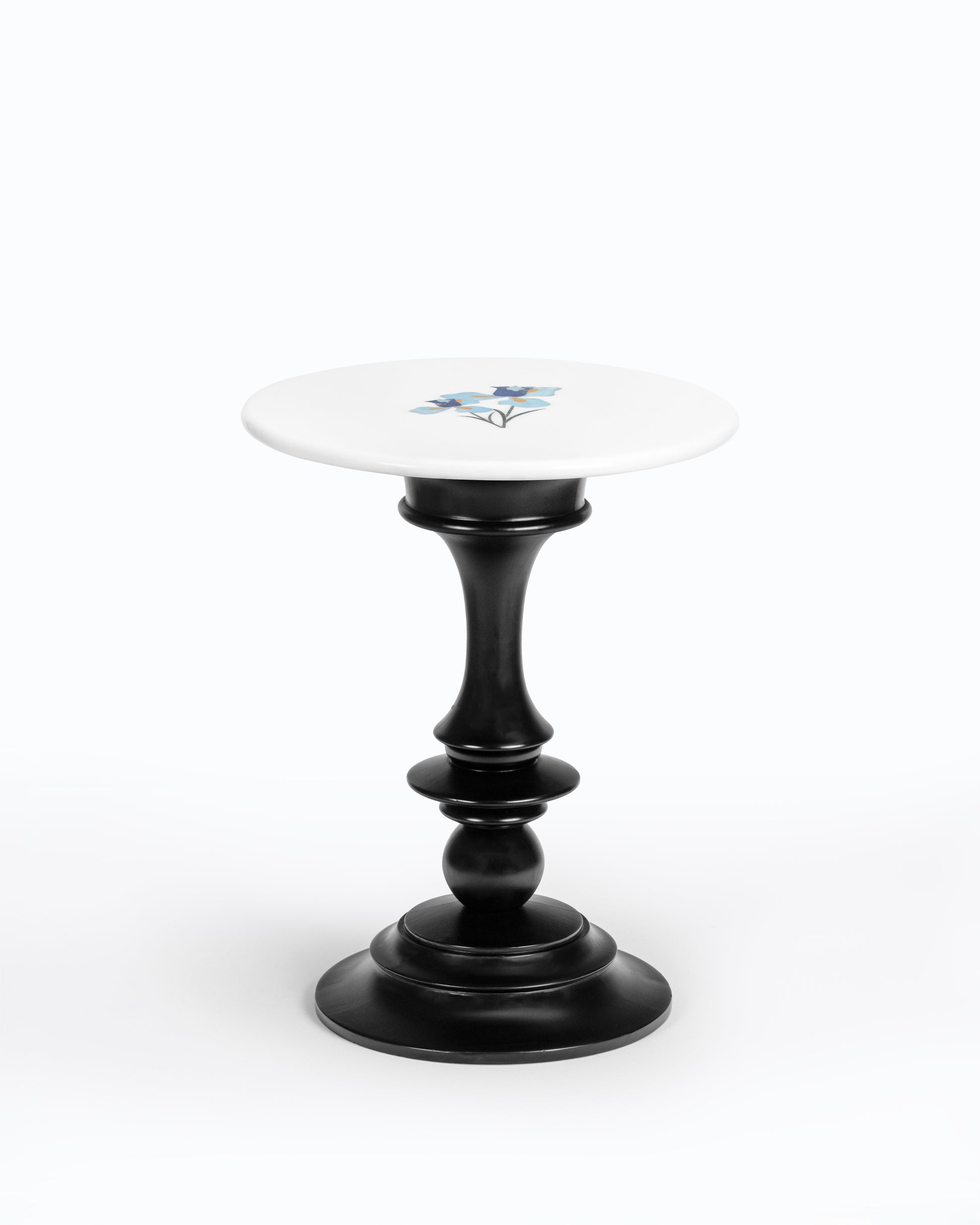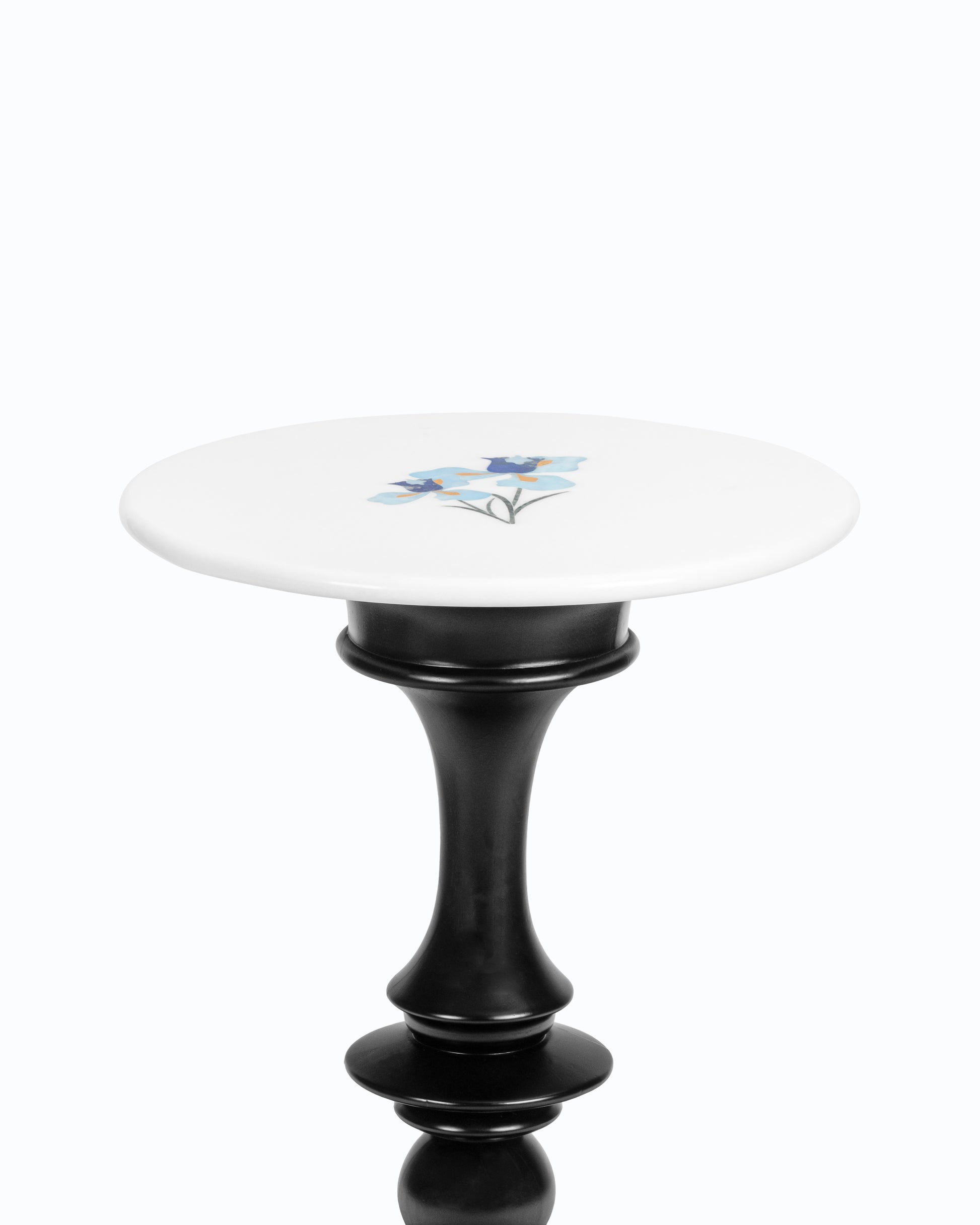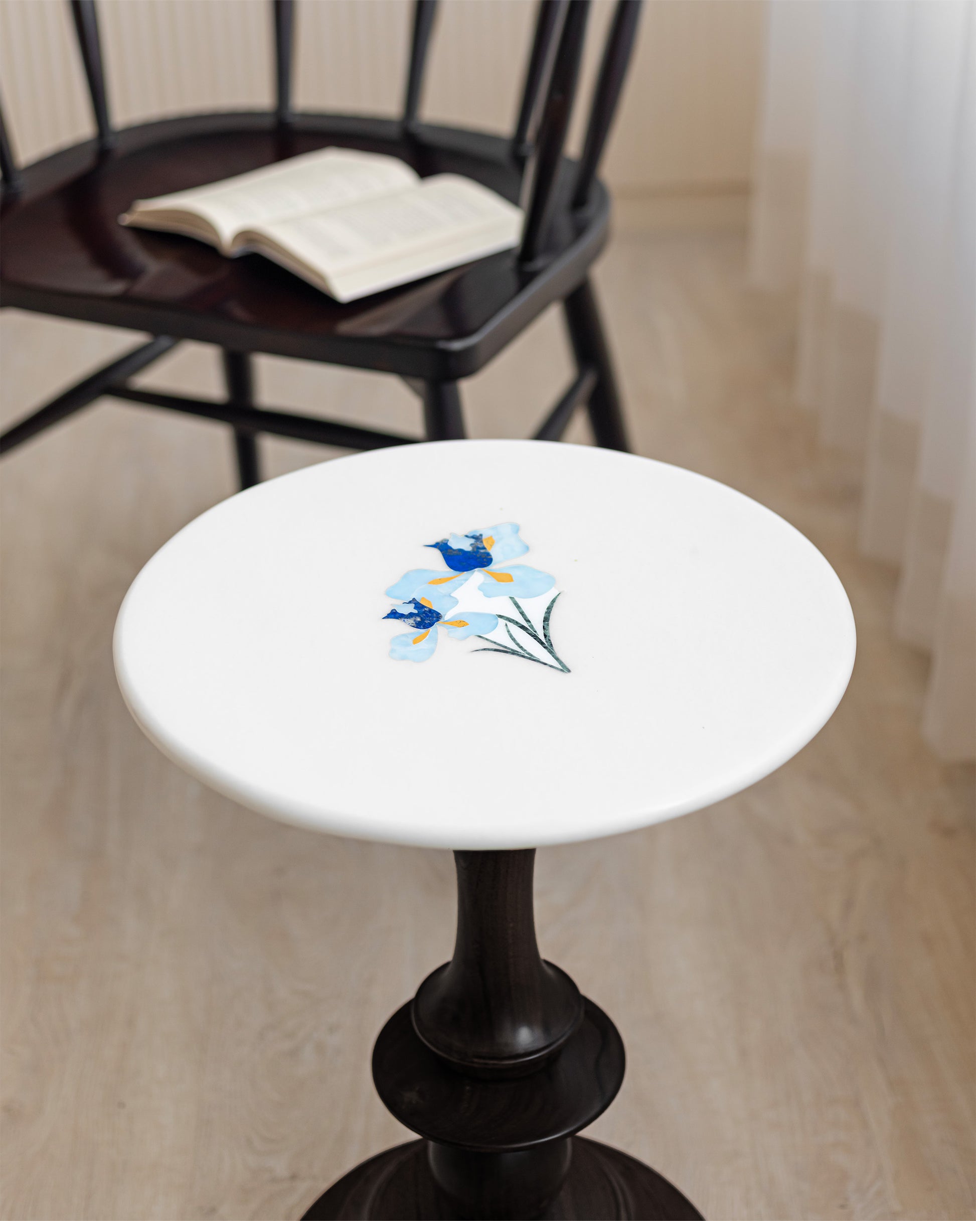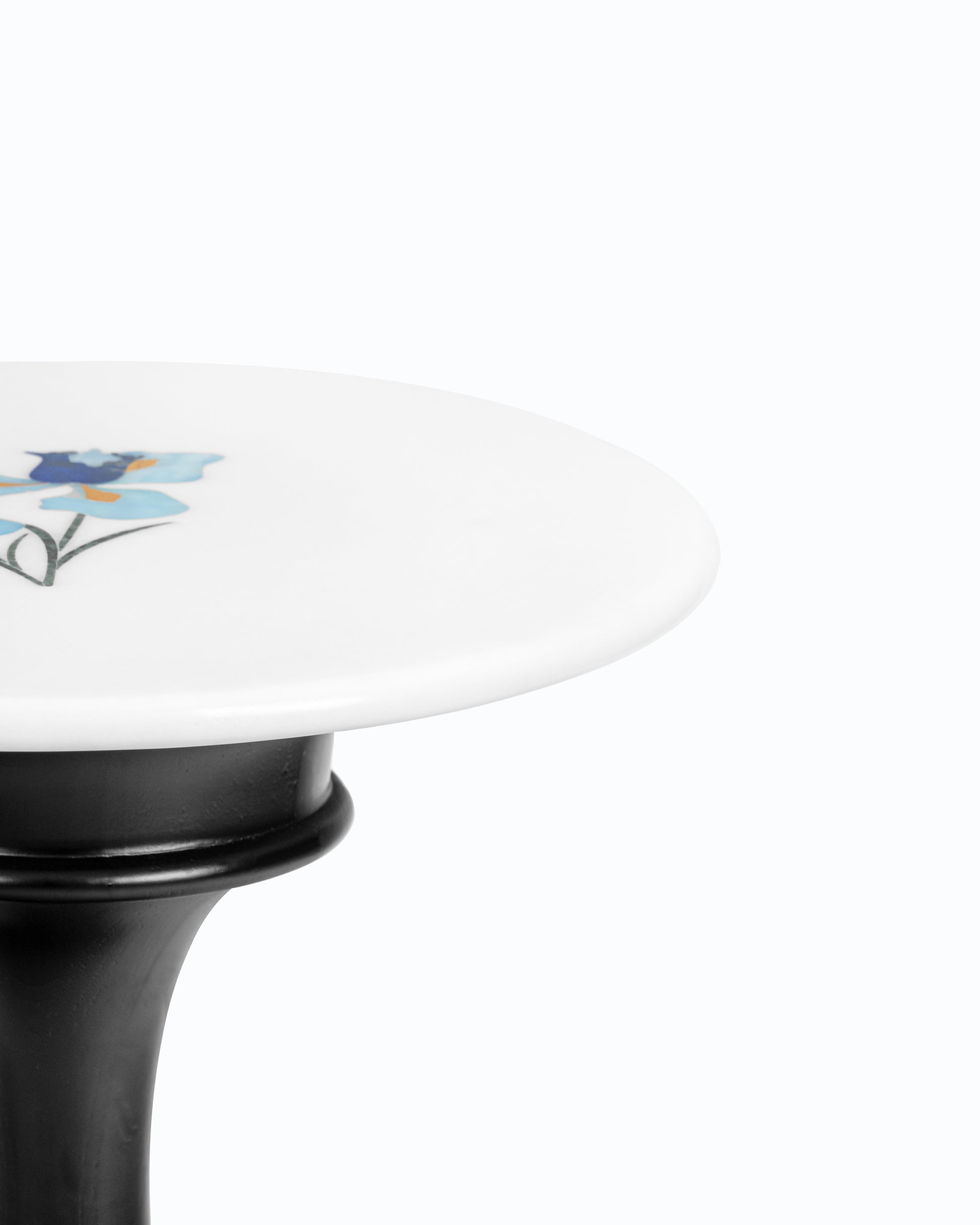 Representing hope, wisdom, trust, and valor, the Iris flower makes an excellent addition to any home. The stunning Iris tabletop includes Jaisalmer sandstone, Lapis Lazuli, Blue Onyx, and Baroda green stone inlays on a white marble surface. The Teak wood base comes in three finishes: Teak, Walnut, and Black.
