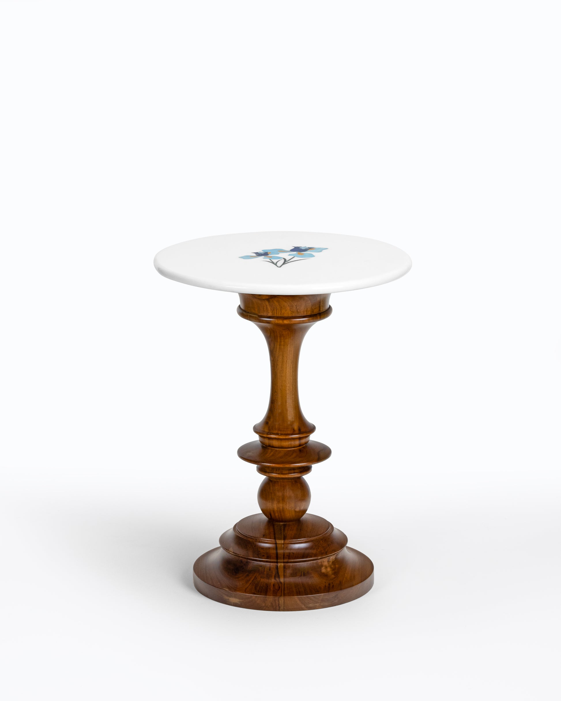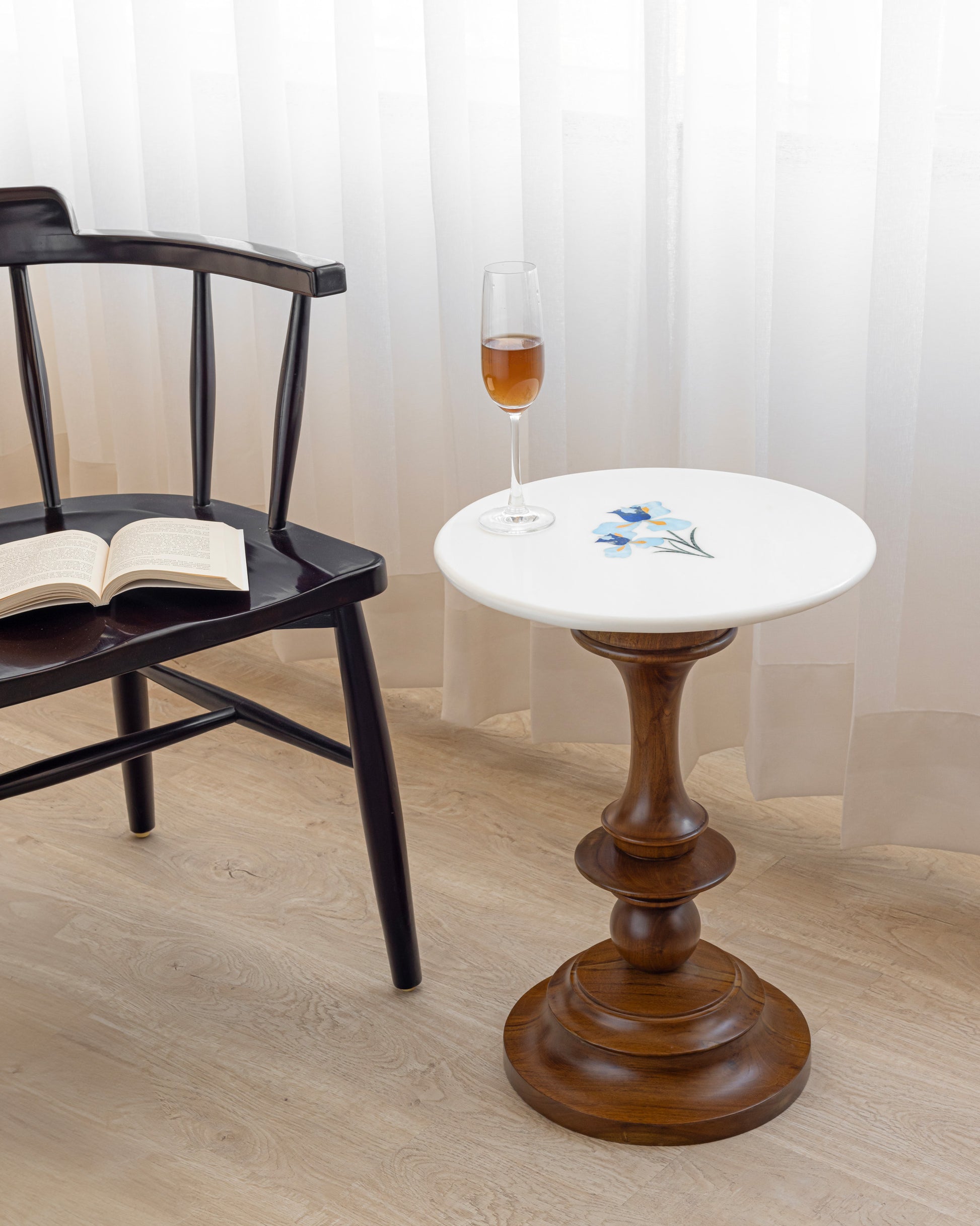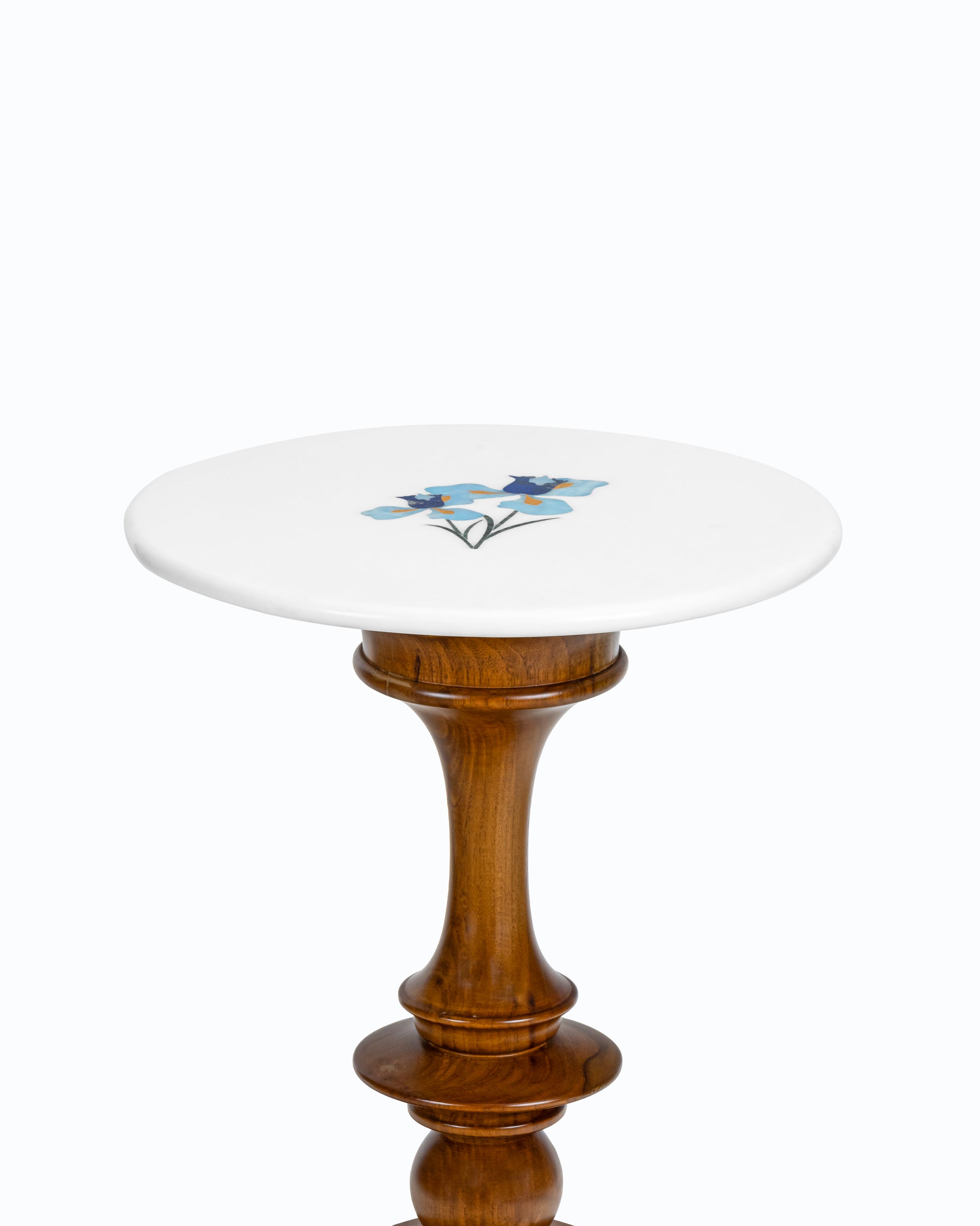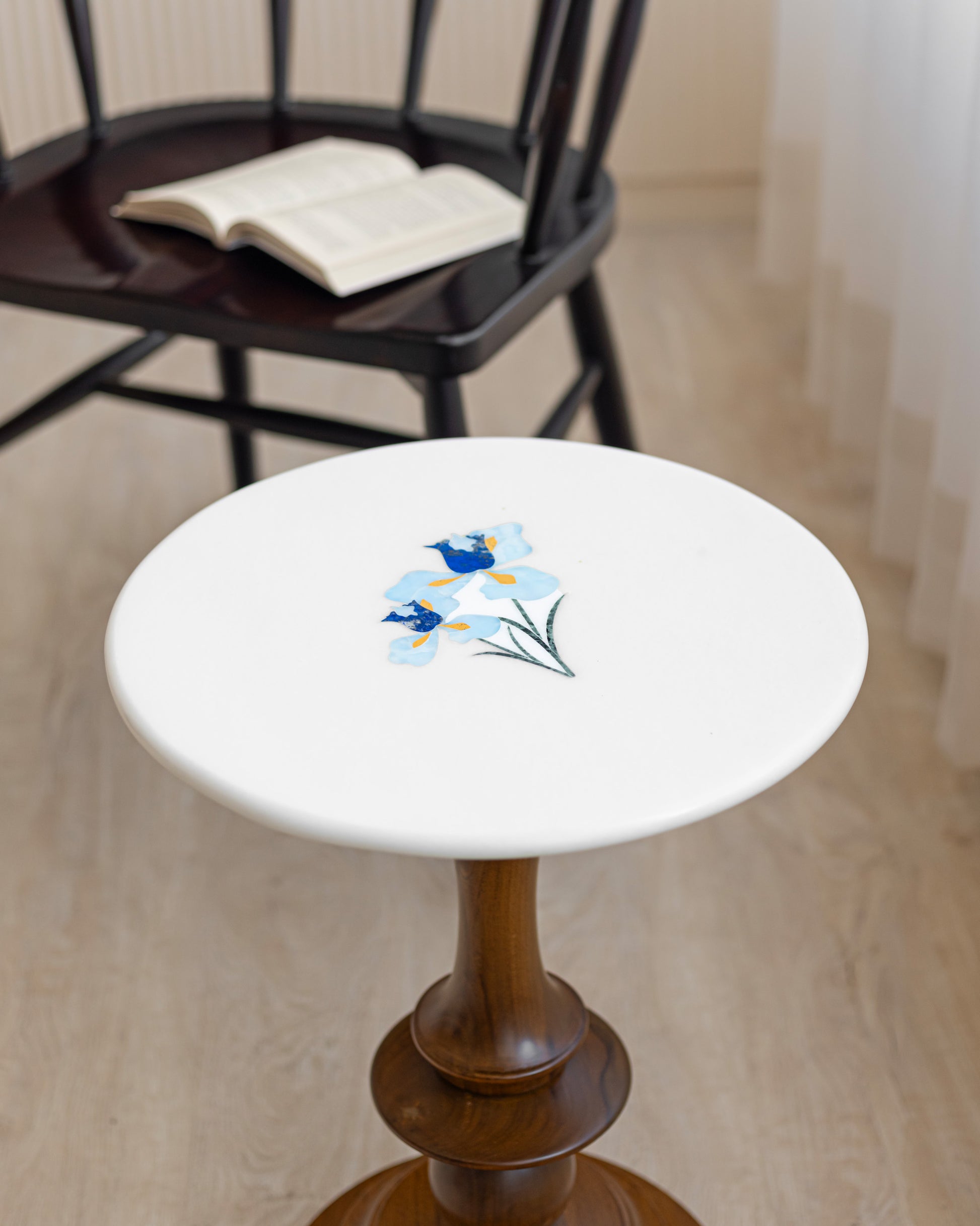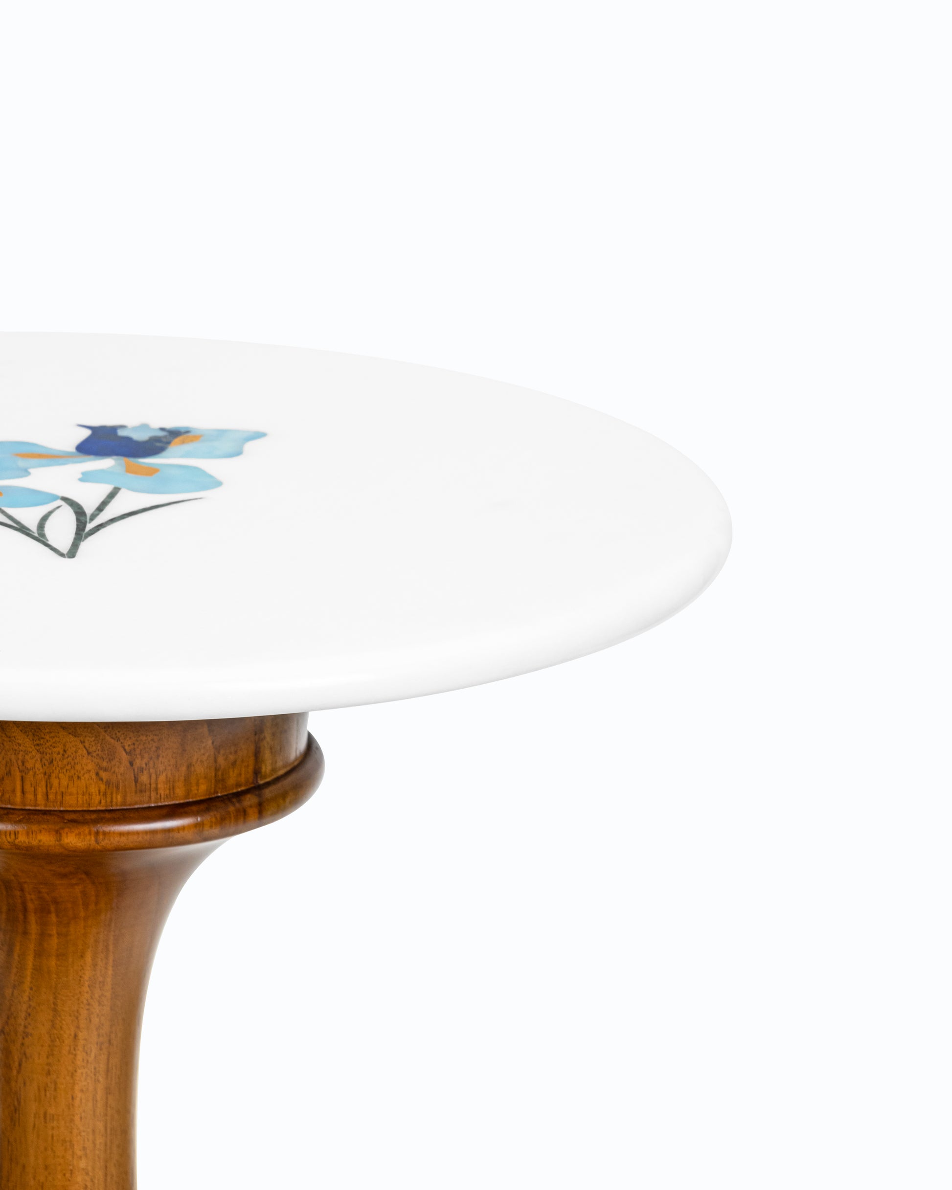 Representing hope, wisdom, trust, and valor, the Iris flower makes an excellent addition to any home. The stunning Iris tabletop includes Jaisalmer sandstone, Lapis Lazuli, Blue Onyx, and Baroda green stone inlays on a white marble surface. The Teak wood base comes in three finishes: Teak, Walnut, and Black.