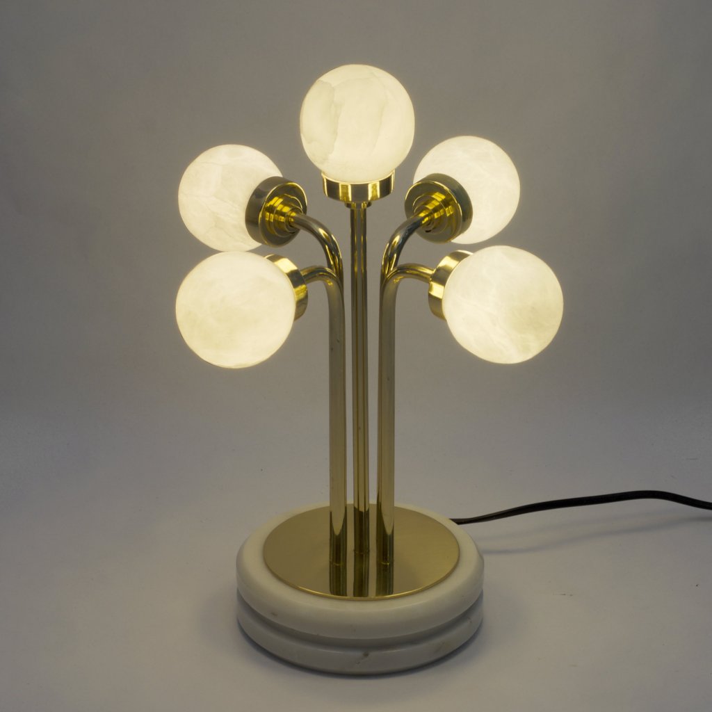 Standing on a marble base with brass pipes birthing out of it branching into moon bulbs made in alabaster stone.