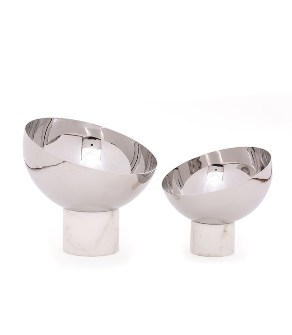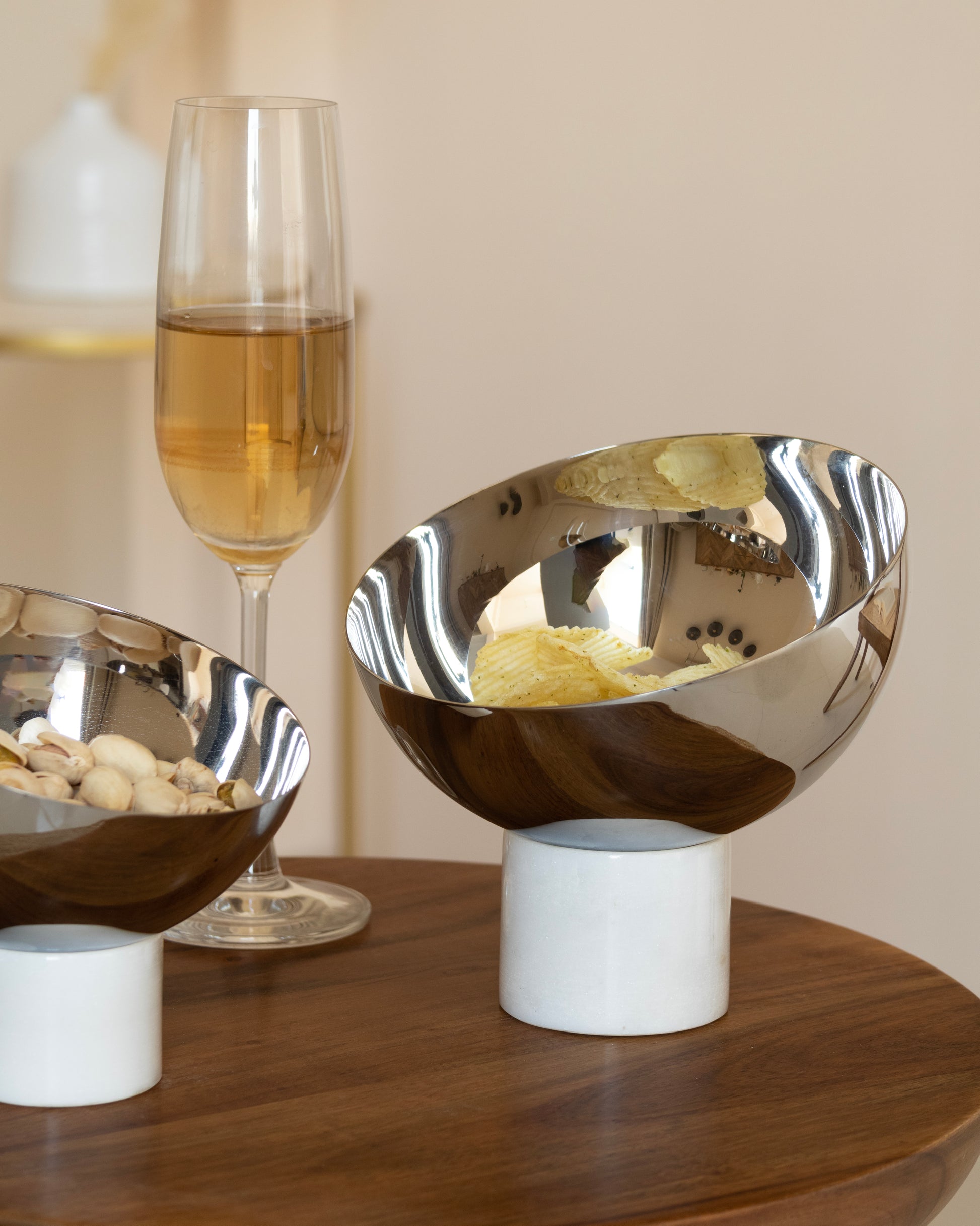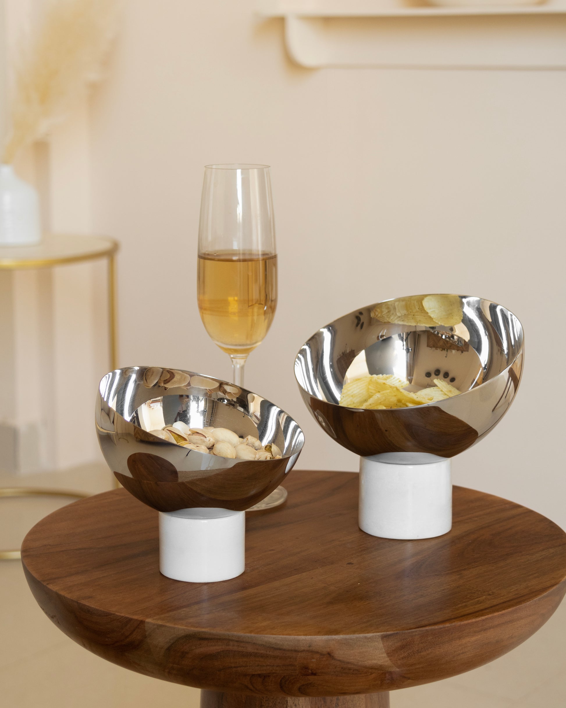 This delicately formed serve ware is made in fine stainless steel and polished white marble. Offering a richness that flaunts a beautiful mirror finish, Para Bowls are an ideal choice for serve ware that marks its presence.