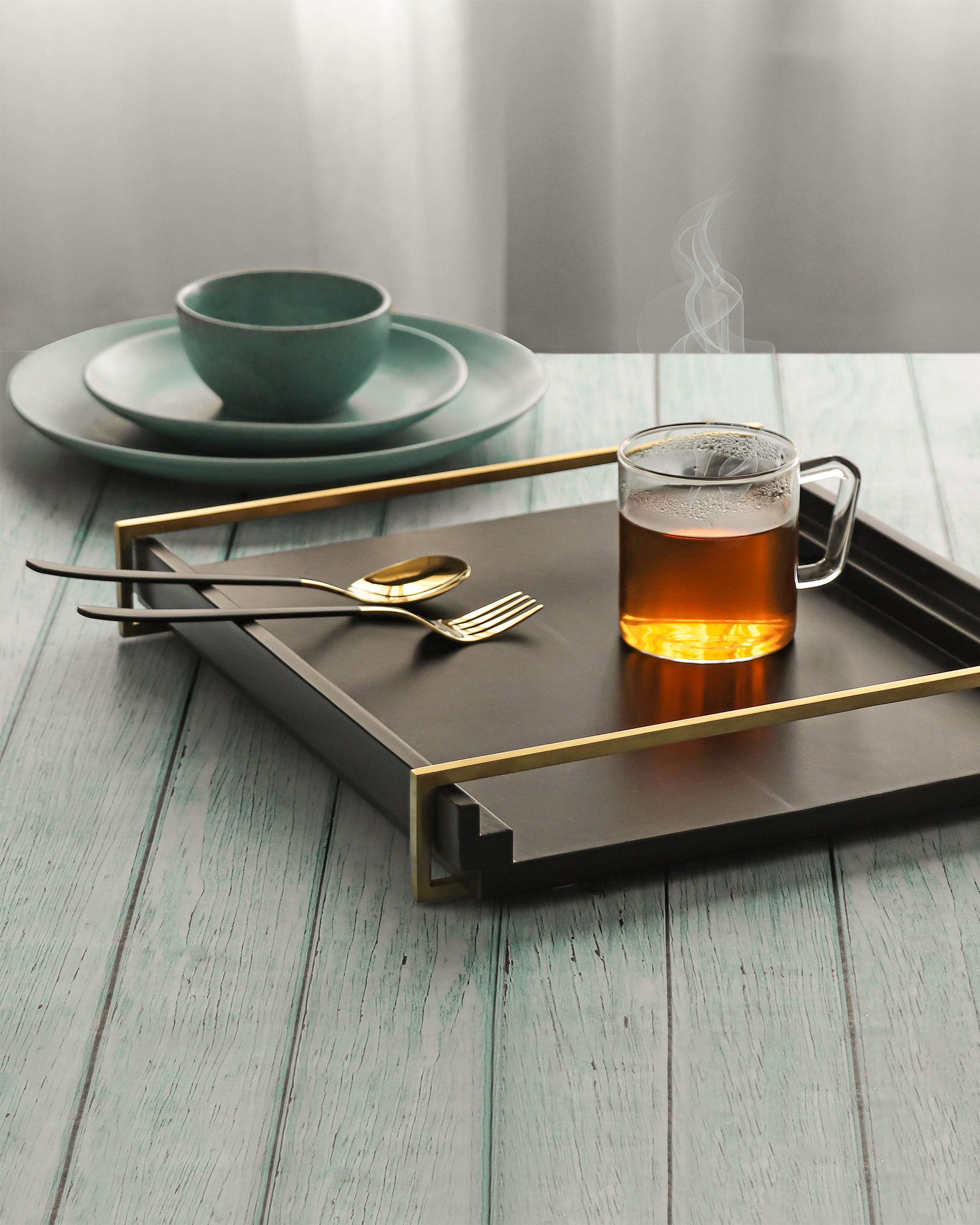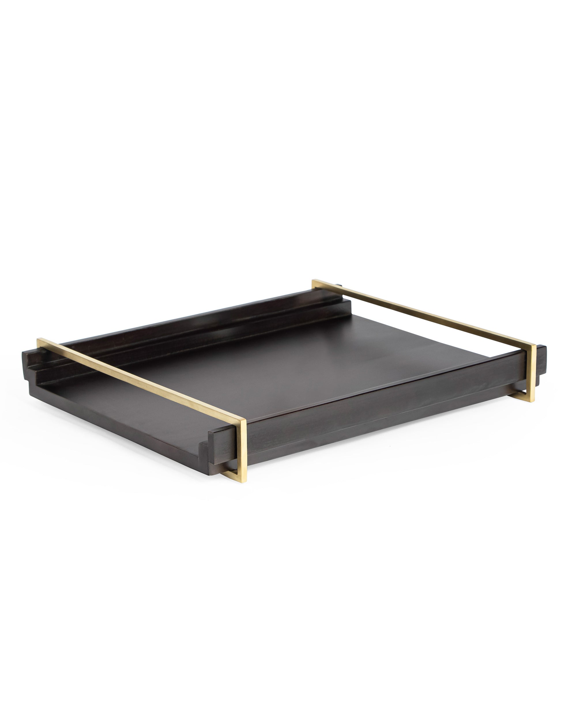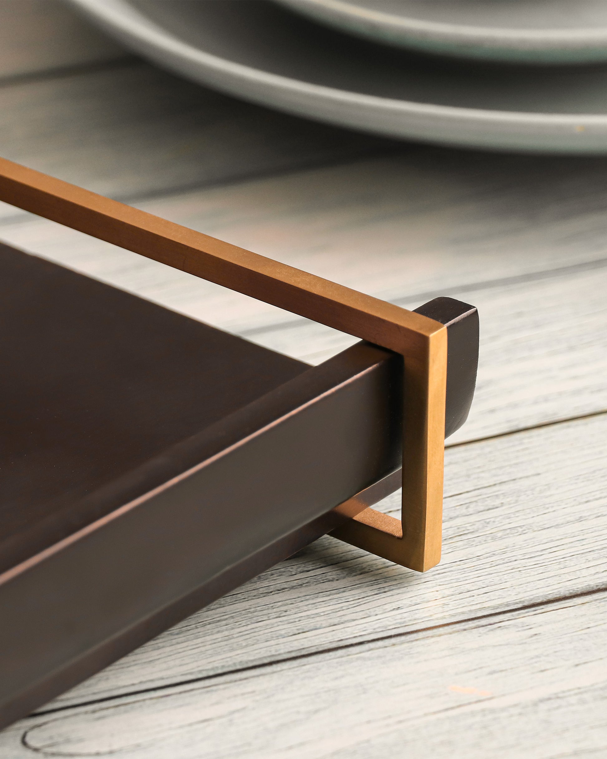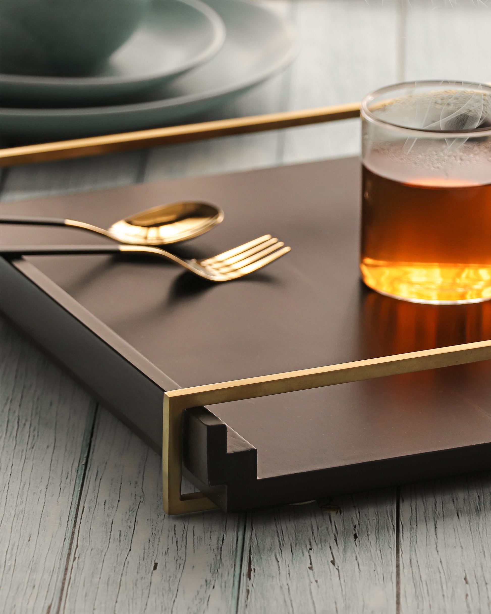 Crafted with fine perfection, the tread tray offers a blend of convenience with style. Carved to a rectangular iteration for contemporary appeal, the matt wooden base-paired is with brass gold PVD finish stainless steel handles on top for easy carrying.