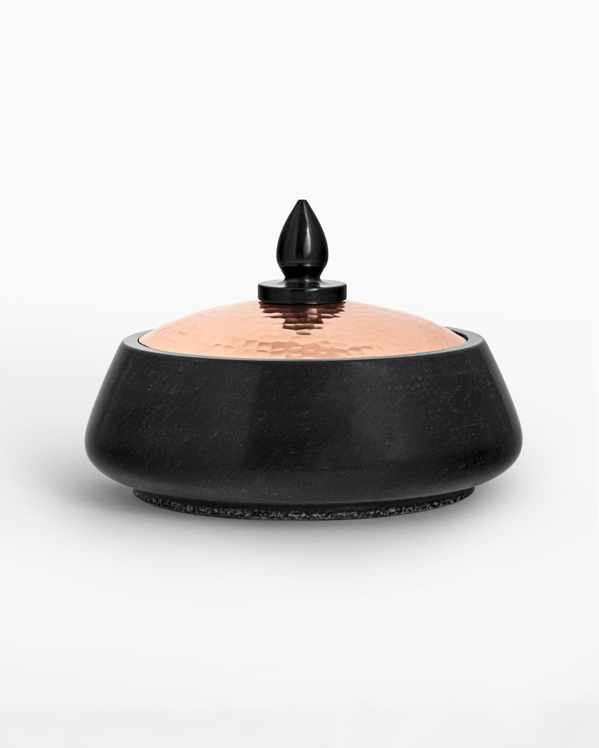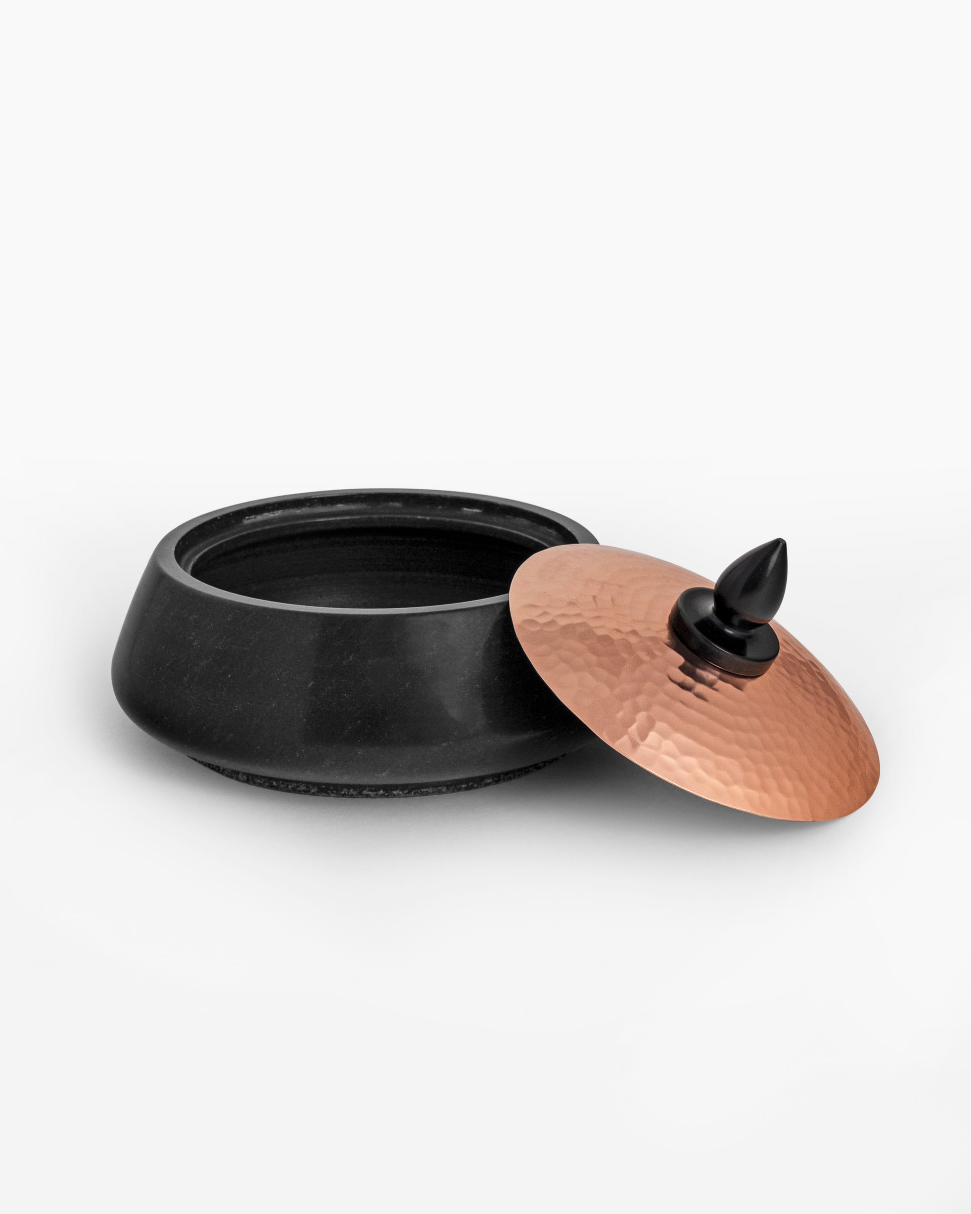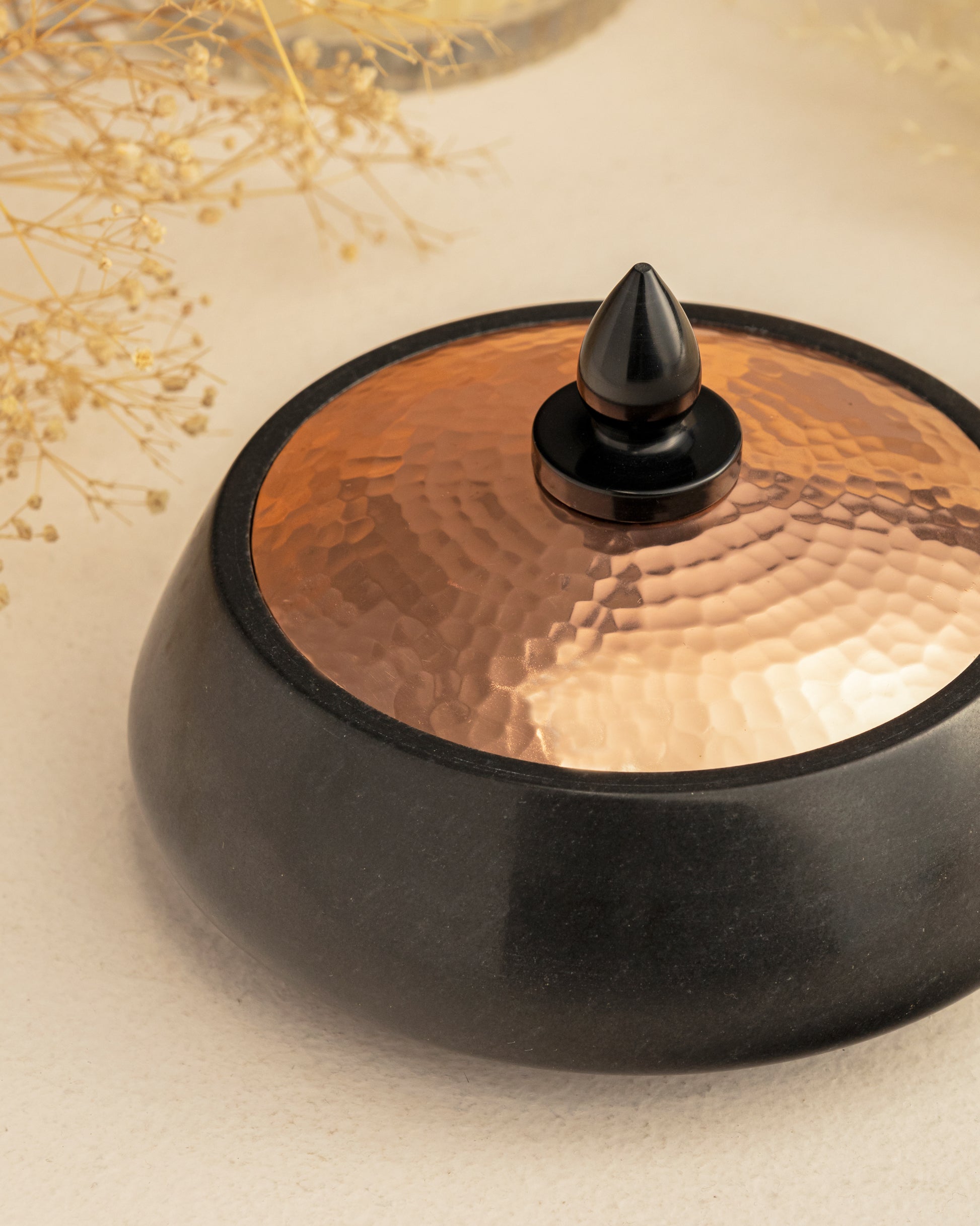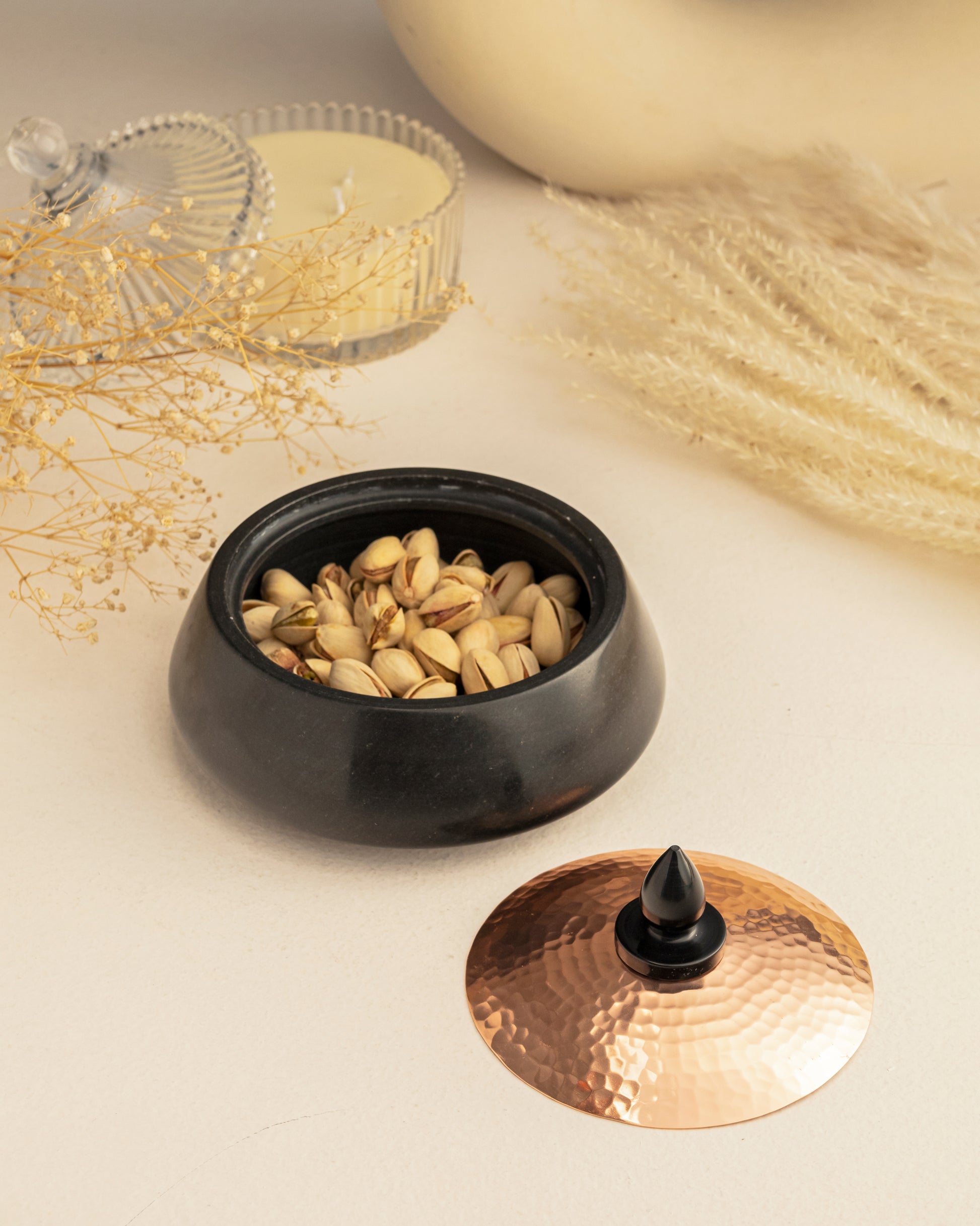 Round cut and finished, the bowl is made of Bhainslana marble native to Rajasthan. Keep it neat with the delicate removable lid. This marble can stain when exposed to dark colors like red wine, turmeric, or beetroot. It’s best used for serving dry snacks or keeping knick-knacks.