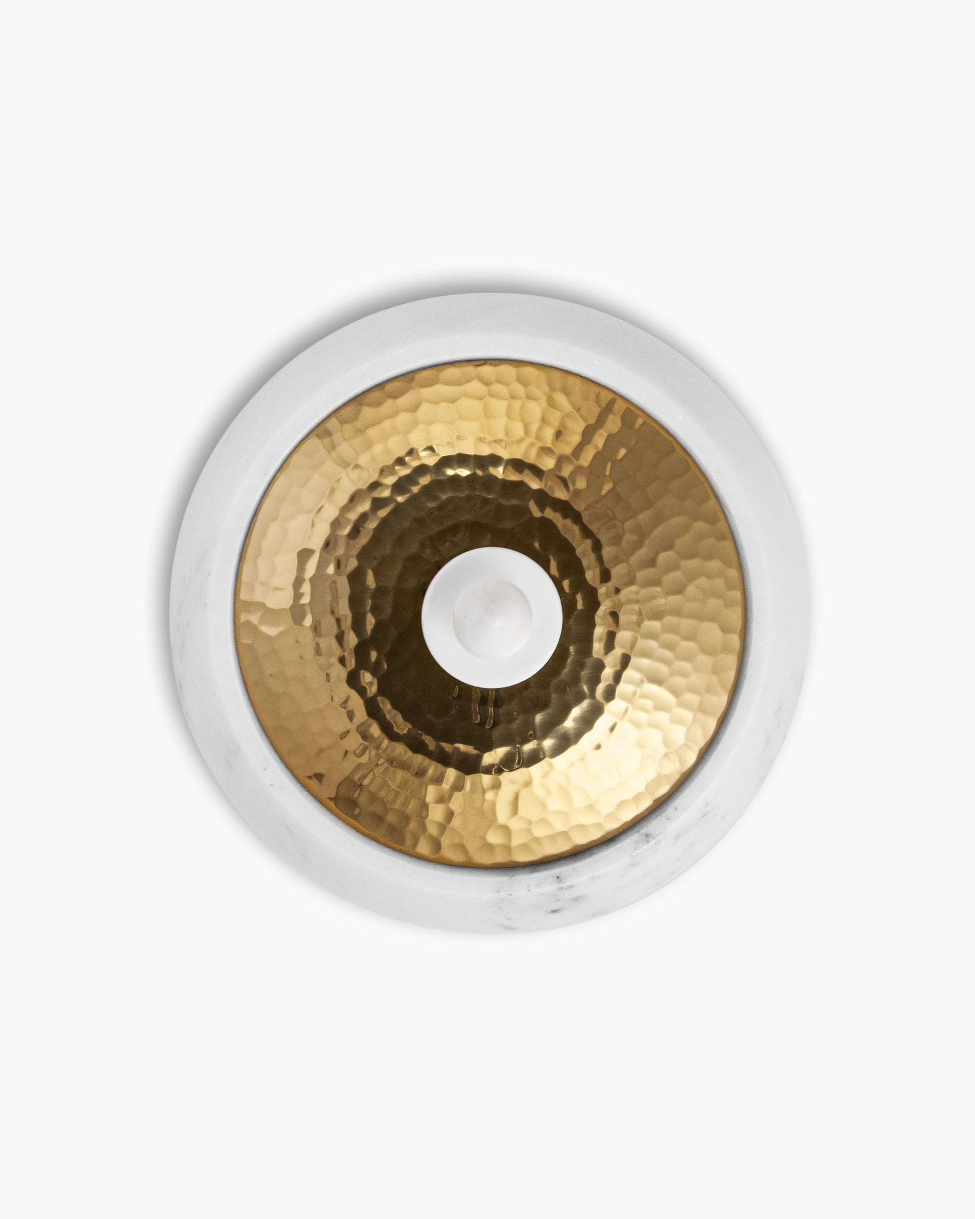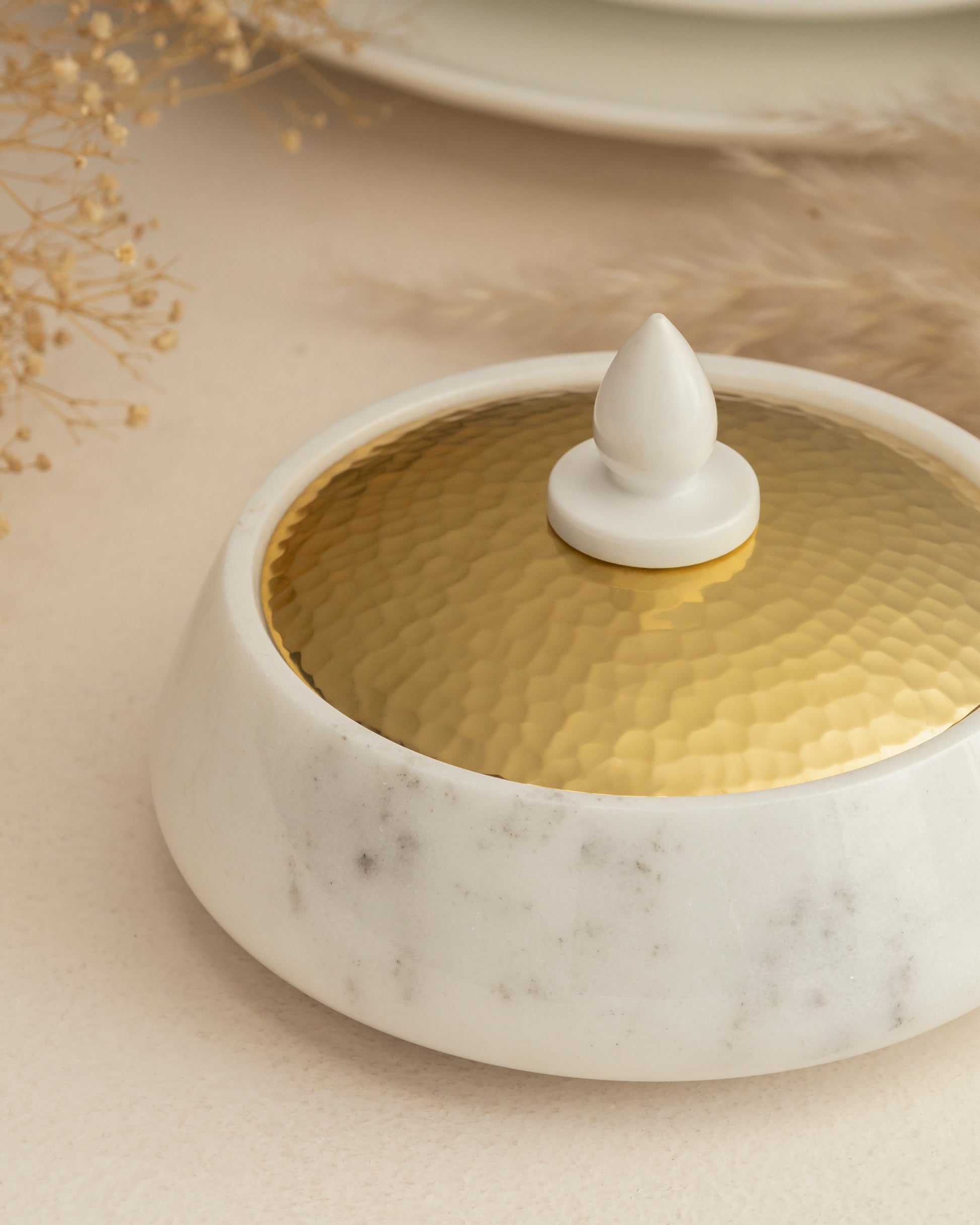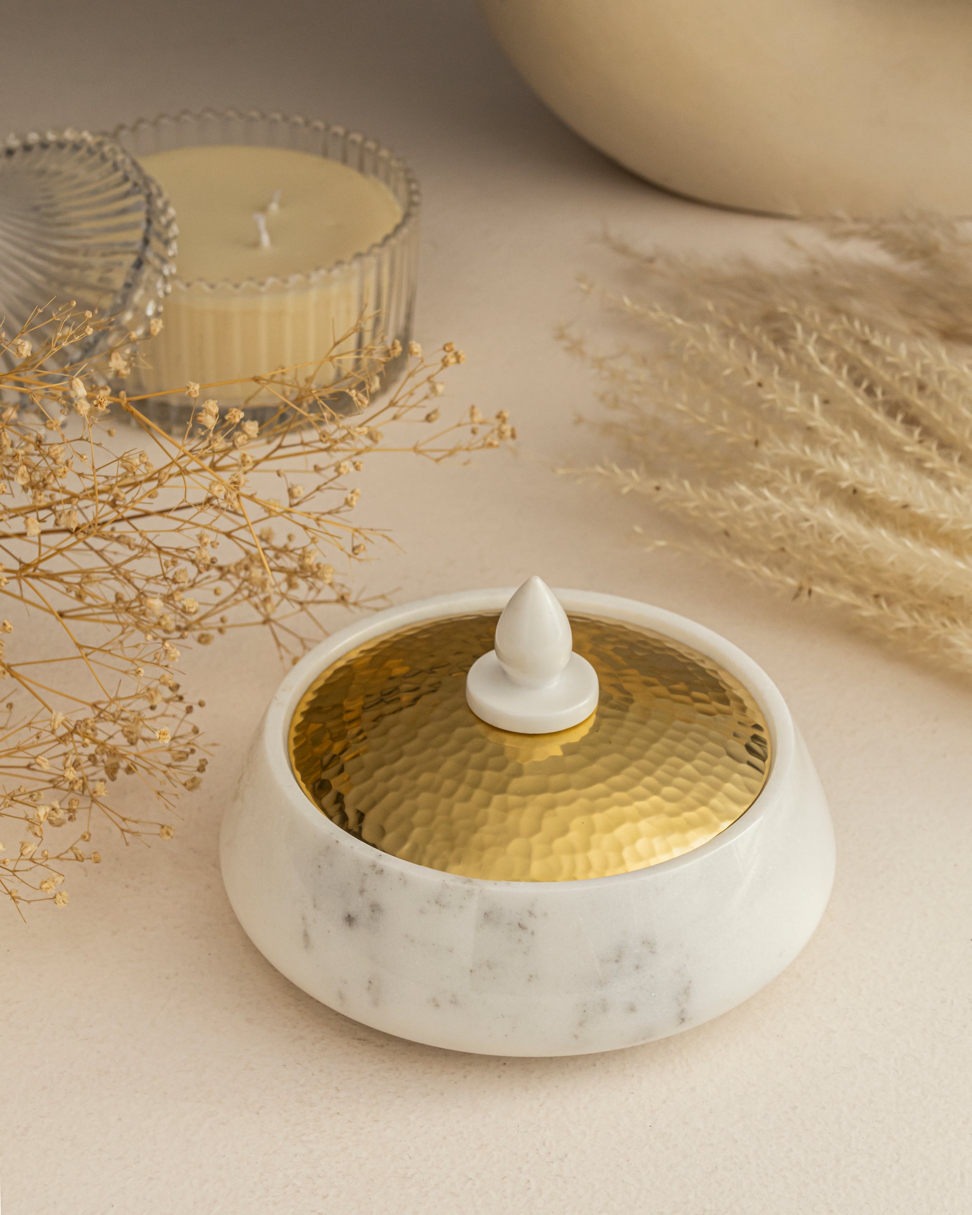 Round cut and finished, the bowl is made of Andhi marble native to Rajasthan. Keep it neat with the delicate removable lid. This soft white marble can stain when exposed to dark colors like red wine, turmeric, or beetroot. It’s best used for serving dry snacks or keeping knick-knacks. There are two variants available.